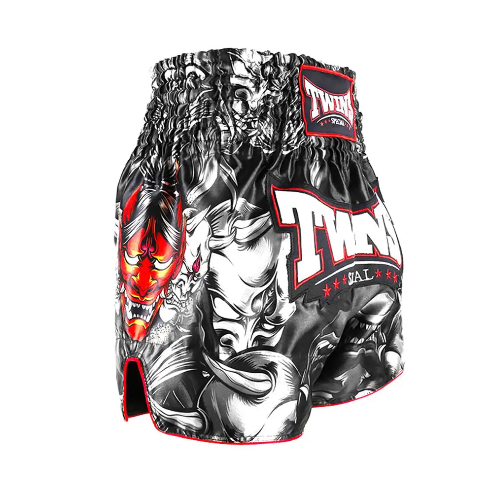 High quality satin Twins Muay Thai shorts, featuring an intricate, black and grey “Kabuki” design, finished with a very high standard of embroidery and craftsmanship.